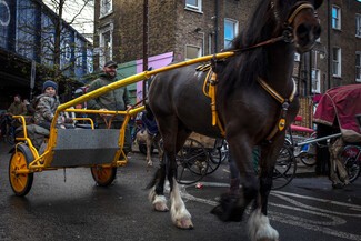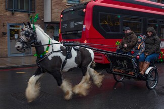 It’s a wet, wintry Saturday lunchtime, the day of the London Christmas Drive, and we are standing on Camden High Street straining to listen out for the unmistakable clip-clopping of loads of horses trotting in time to each other. Camden's main drag is ram-packed with Christmas shoppers and tourists, I’m trying to keep my camera dry, and the Drive, which set off from east London an hour earlier, has not yet arrived.
