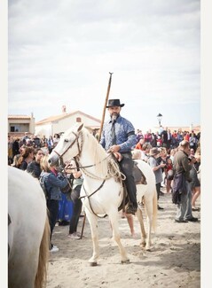 The church bells ring as tourists stand behind crowd barriers, and the Romanies are at the doors of the church whilst men on white horses wait patiently. "Viva Sainte Marie, viva Sainte Sara," is the melodic chant from the crowd. After hours in the hot sun waiting in anticipation, Saint Sara hits the streets, held high above her adoring people, wearing a cloak as blue as the heavens and a halo of gold above her crown, slowly moving through the crowd as followers touch the hem of her dress.