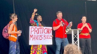 Standing on the stage at the anti-austerity and anti-racism rally, Drive2Survive Co-Chair Jake Bowers encouraged the crowd at the rally to chant ‘Priti chum mandy’s bull’, which translates in English as ‘Priti kiss my a***’. The chant was also translated into sign language by a British Sign Language interpreter.